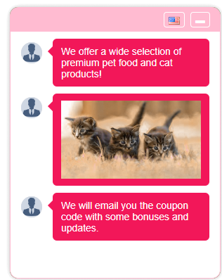 Design interactive customer journeys and chat flows from scratch with ease. Let users interact with your chat, answer questions, make decisions, click buttons and claim a reward at the end for completing a task or a purchase!